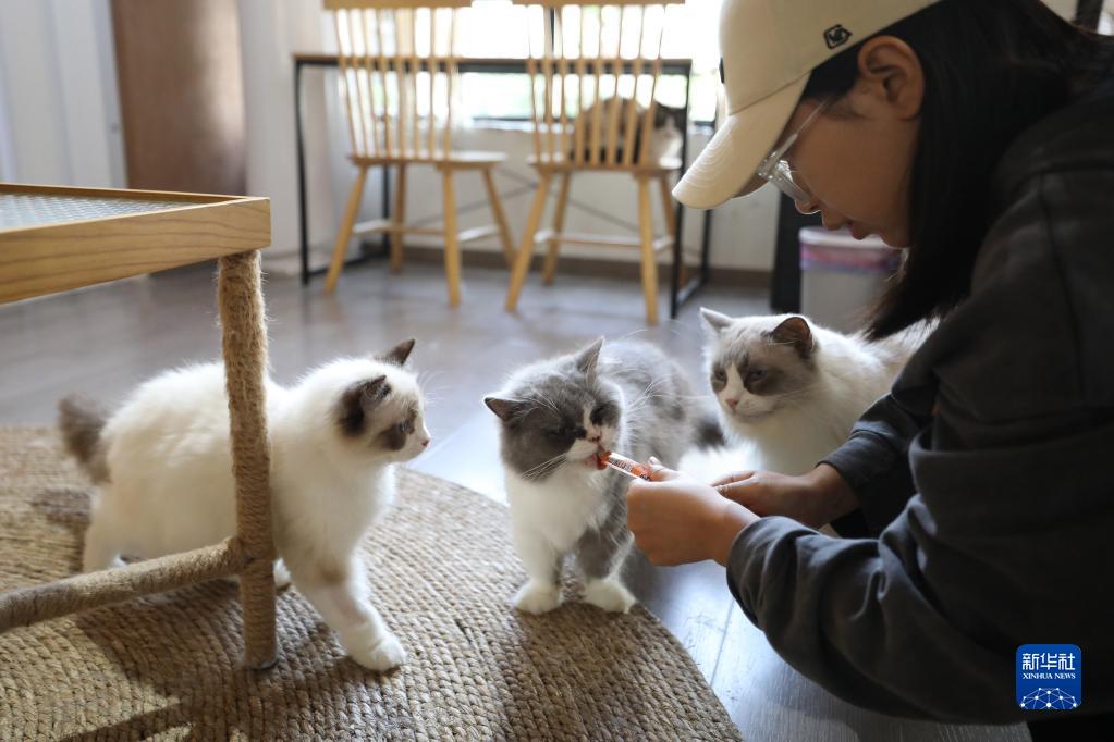 5月23日,在浙江省義烏市李祖村,貓咖“貓的小院”店長(cháng)在開(kāi)店前給貓喂零食。
