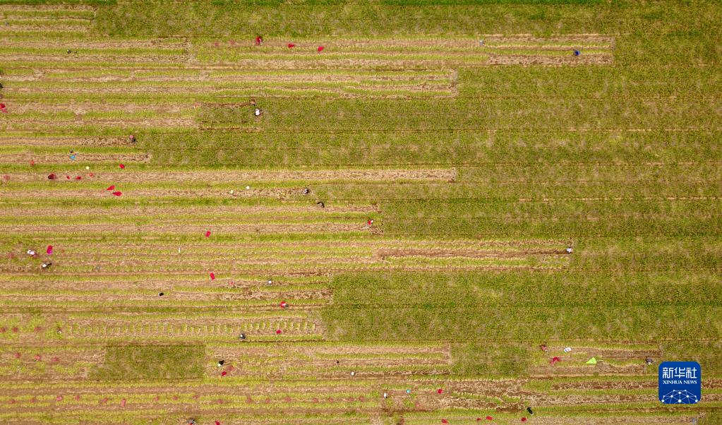 5月23日,在山東省巨野縣田橋鎮,村民在收獲大蒜(無(wú)人機照片)。