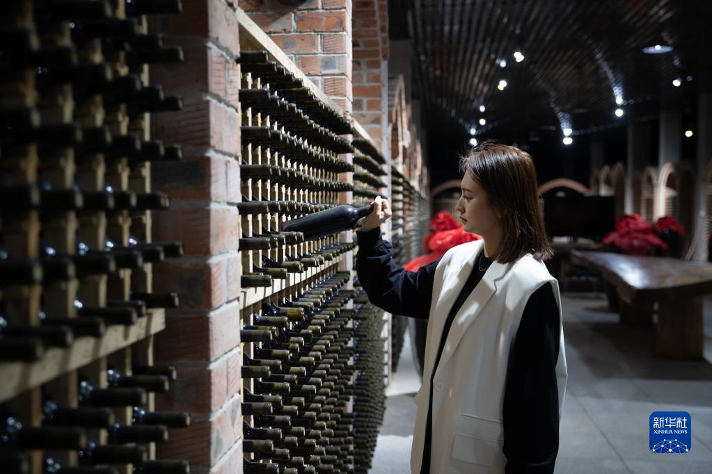 5月19日,在越橘莊園酒窖內,工作人員在檢查藍莓酒儲藏情況。