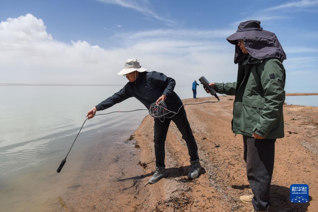 科考隊員在新疆東昆侖庫木庫里盆地利用水質(zhì)速測儀測量水質(zhì)(5月23日攝)。