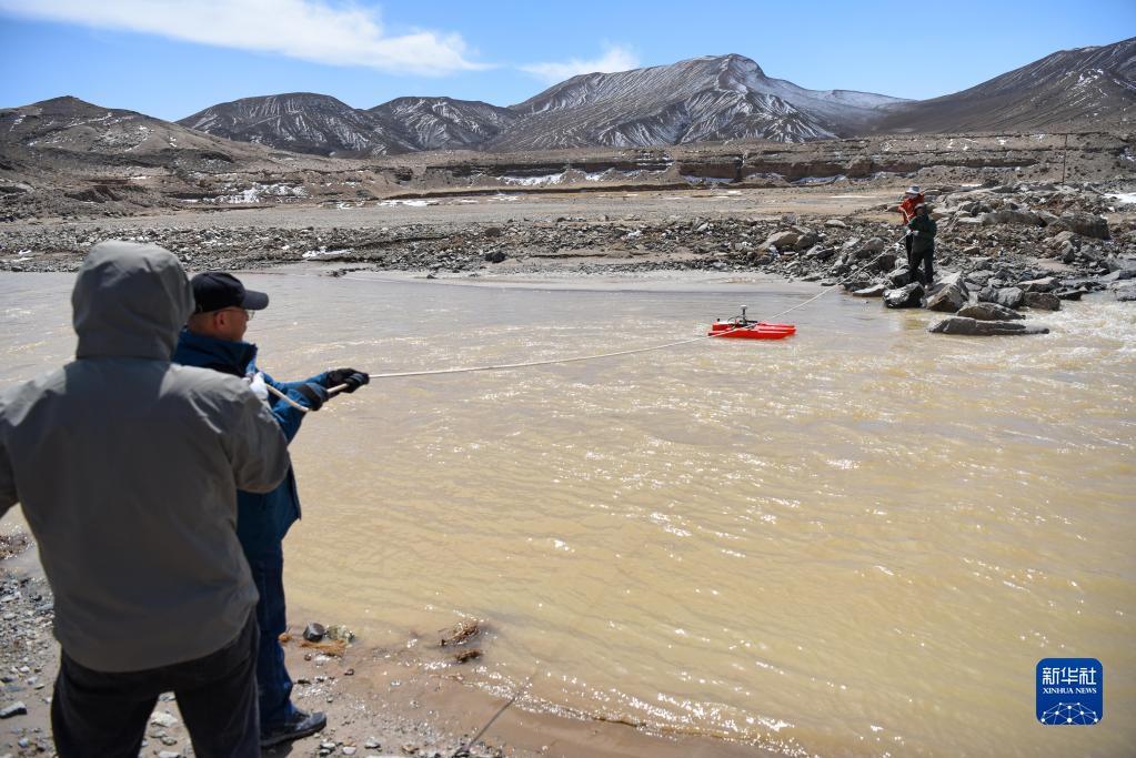 科考隊員在新疆東昆侖庫木庫里盆地通過(guò)多普勒測流船測量河流流速流量(5月22日攝)。