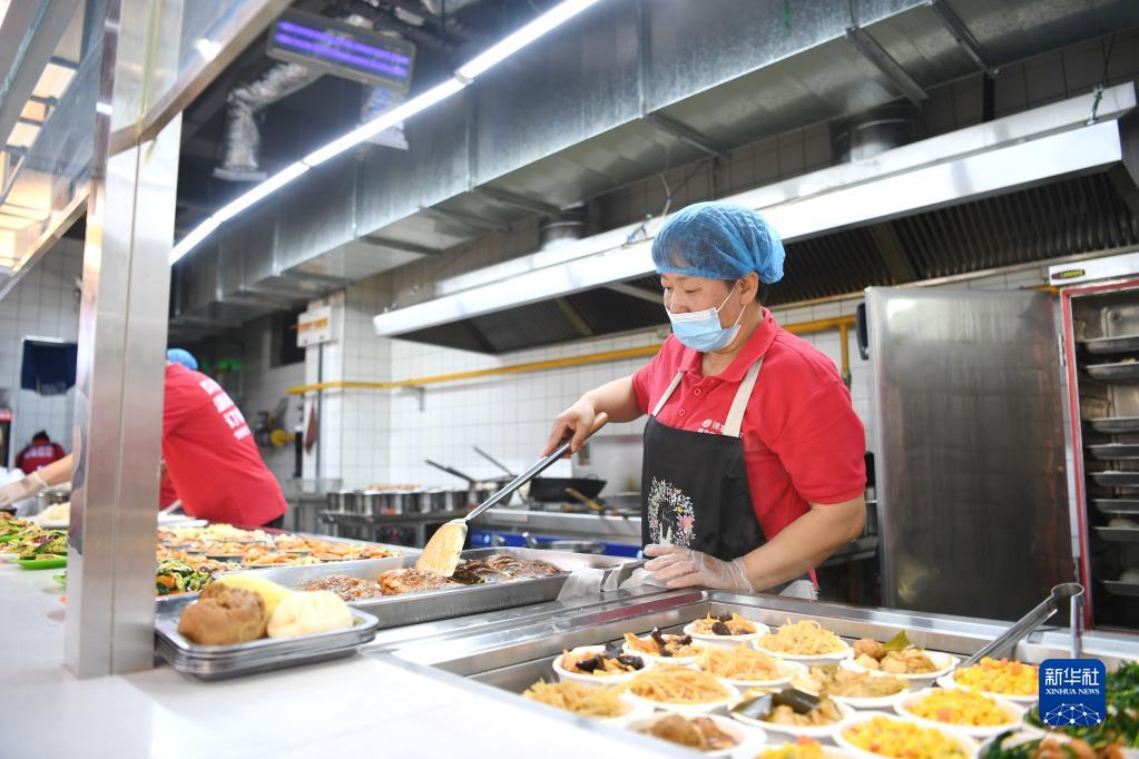 河北雄安新區容東片區南文營(yíng)社區食堂工作人員在取餐口配餐(5月23日攝)。