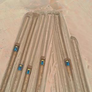5月24日,機械工程車(chē)輛在達拉特旗庫布其沙漠中施工(無(wú)人機照片)。