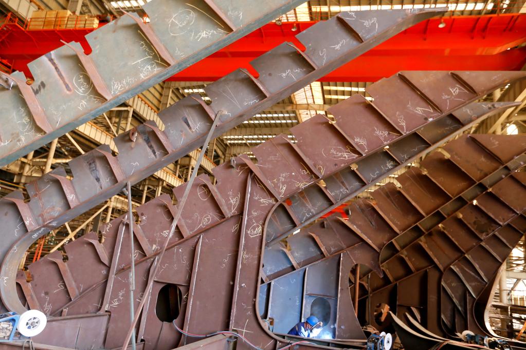 5月23日,位于青島市即墨田橫島省級旅游度假區的青島造船廠(chǎng),工人在進(jìn)行船體制造。
