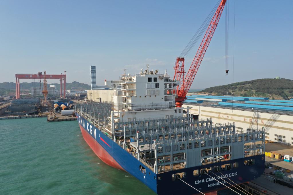 5月23日在青島造船廠(chǎng)拍攝的一艘即將交付的船舶(無(wú)人機照片)。