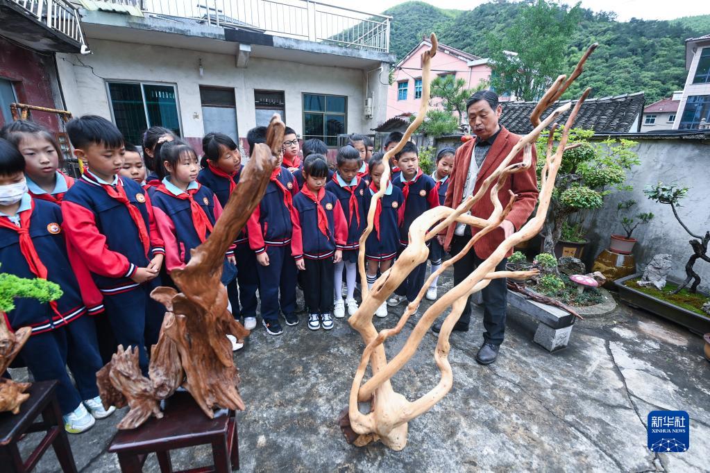 5月24日,煤山鎮新民村非遺傳承人佘廣坤(右一)在給長(cháng)興縣煤山鎮中心小學(xué)的學(xué)生介紹根雕藝術(shù)。