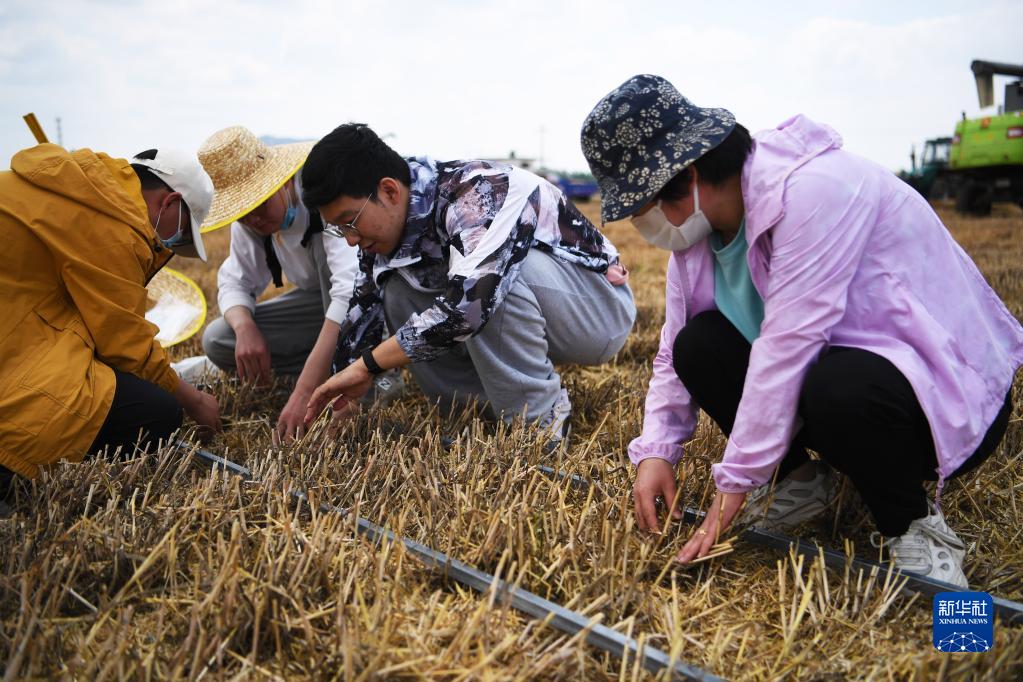 5月24日,在河南省南陽(yáng)市唐河縣的活動(dòng)現場(chǎng),工作人員在選定的采樣區域撿拾掉落的麥粒。
