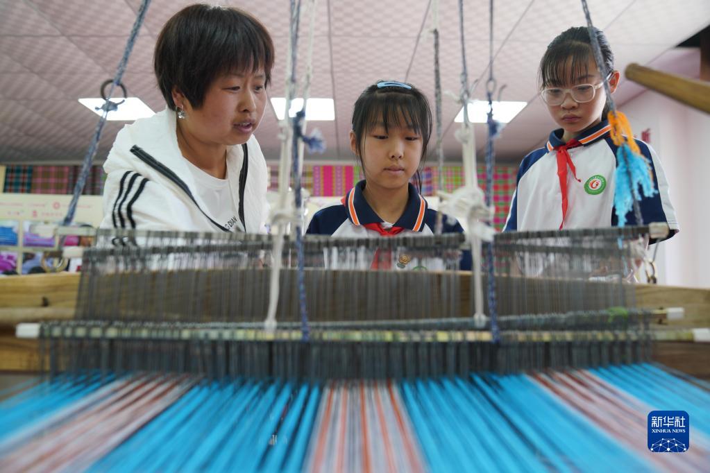 5月24日,小學(xué)生在河北省沙河市塔子峪村非遺傳習所內體驗四匹繒布制作技藝。