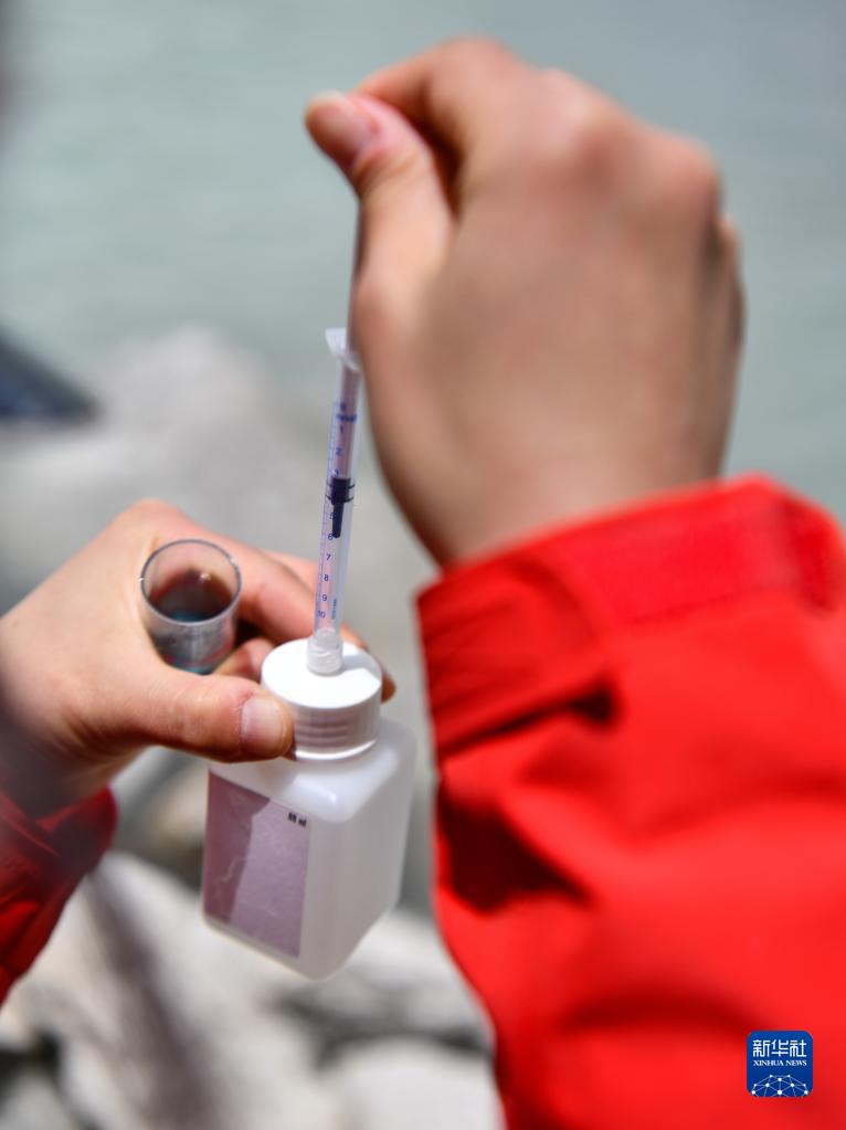 在珠峰海拔約5300米處,來(lái)自中國科學(xué)院青藏高原研究所的科考隊員邱海英在對冰前湖水樣滴定碳酸氫根濃度(5月12日攝)。