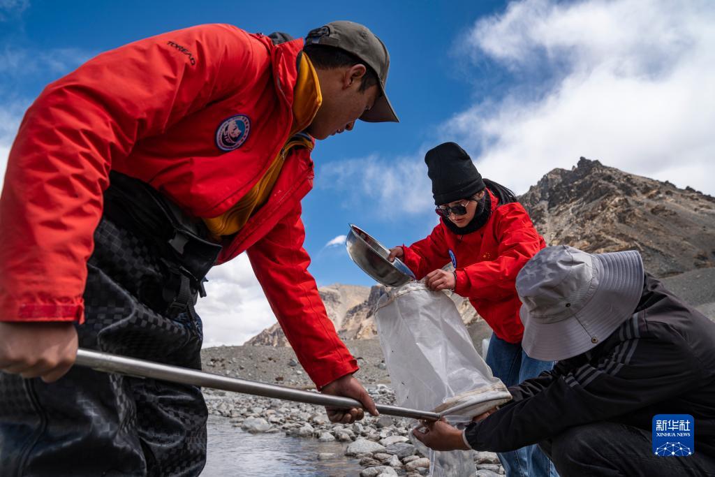 在珠峰登山大本營(yíng)附近,來(lái)自西藏大學(xué)生態(tài)環(huán)境學(xué)院的科考隊員在采集水生生物樣本(5月22日攝)。