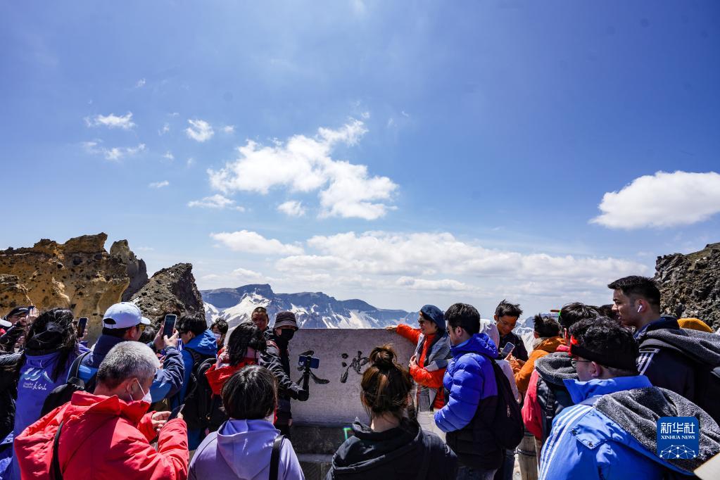 5月24日,游客在長(cháng)白山北景區主峰天池游覽。