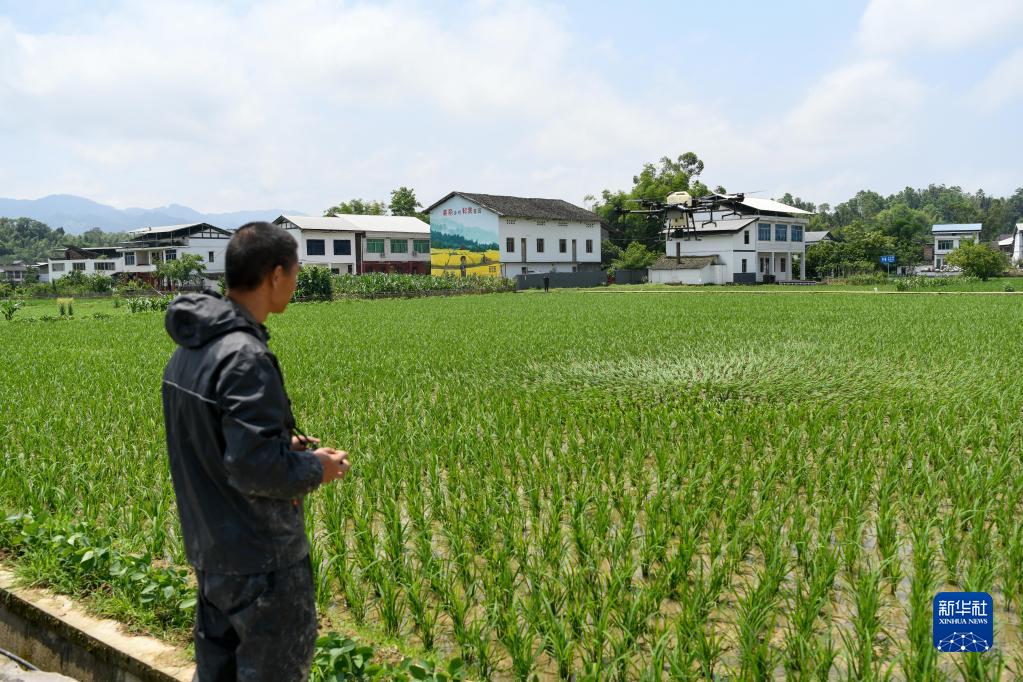 5月24日,在達州達川區萬(wàn)家鎮,農機手在進(jìn)行無(wú)人機噴灑作業(yè)。