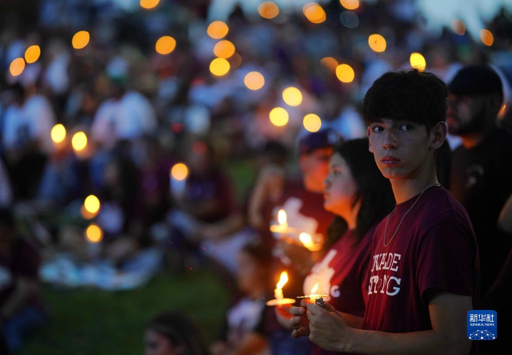 5月24日,在美國得克薩斯州小城尤瓦爾迪,人們參加守夜儀式悼念校園槍擊遇害者。