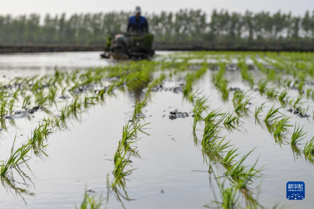 5月24日,農民在吉林省長(cháng)春市九臺區龍嘉街道紅光村操作農機進(jìn)行水稻插秧。