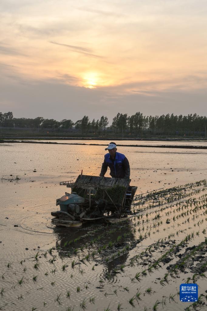 5月24日,農民在吉林省長(cháng)春市九臺區龍嘉街道紅光村操作農機進(jìn)行水稻插秧。