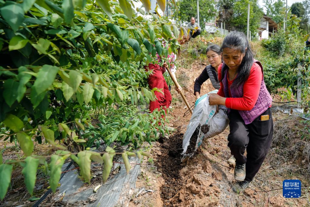 5月24日,在南江縣高橋鎮桅桿村,當地百姓將南江黃羊糞制成的有機肥施到金銀花田里。