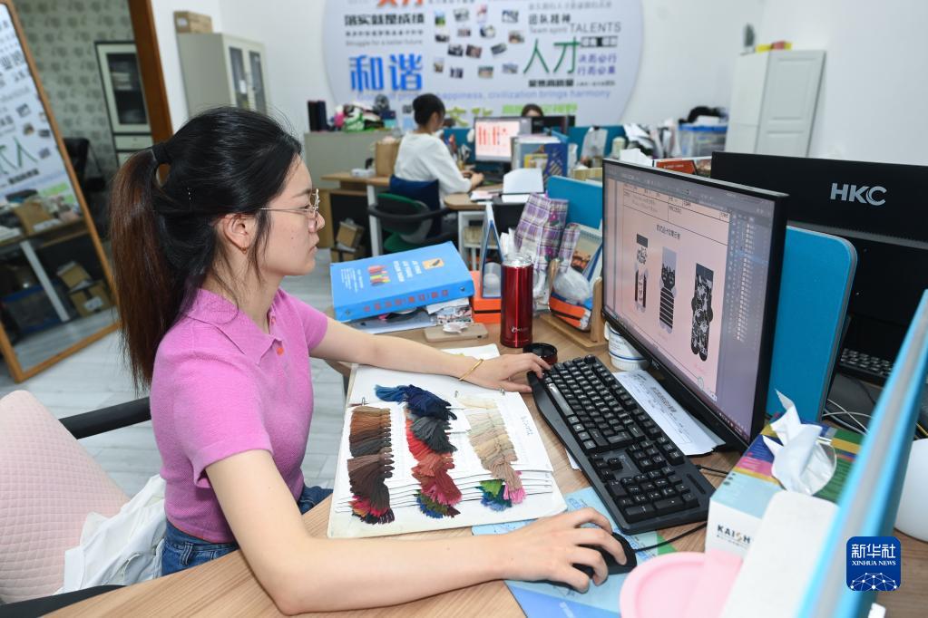 5月25日,位于浙江省諸暨市大唐街道的浙江凱詩(shī)利科技有限公司的設計人員在設計新款襪品。