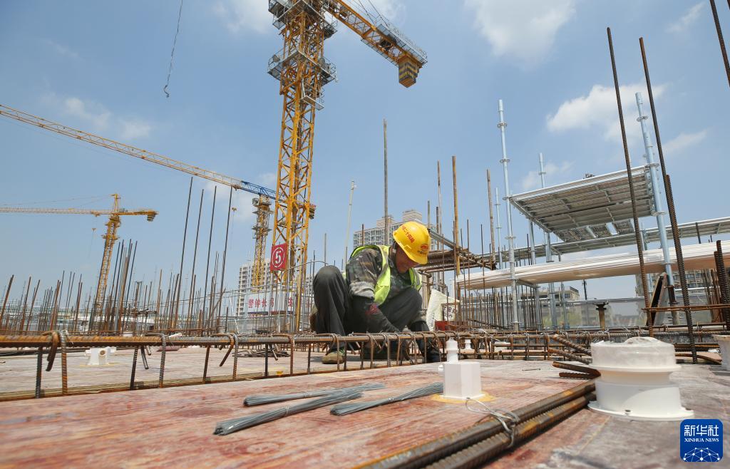 5月25日,工人在彭一小區舊住房改造項目工地上進(jìn)行混凝土墻體鋼筋綁扎作業(yè)。