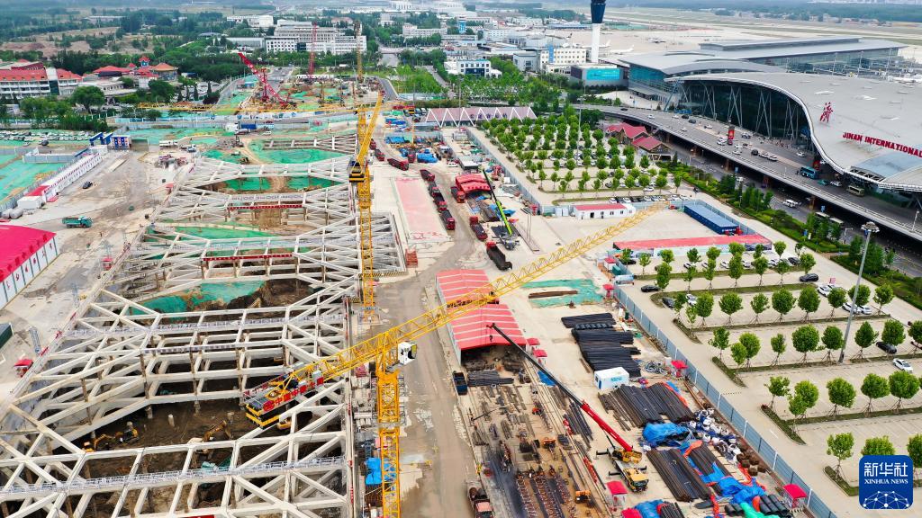 5月25日拍攝的濟南遙墻機場(chǎng)綜合交通樞紐工程施工現場(chǎng)。