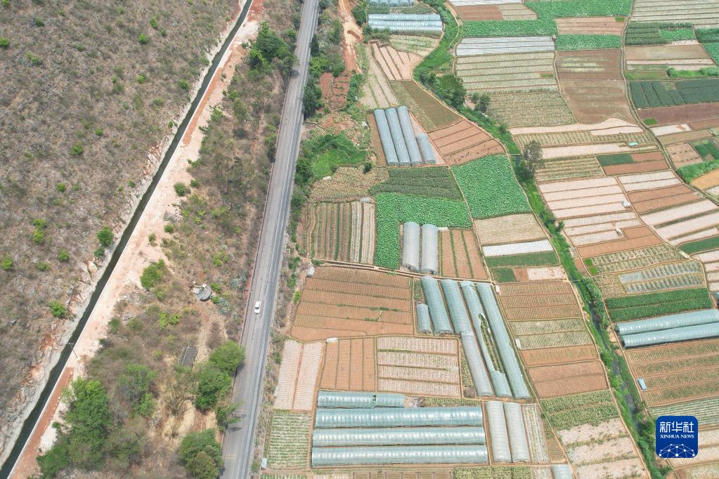 彌瀘灌區內節水改造后的彌勒市甸惠渠(左)(5月9日攝,無(wú)人機照片)。新華社記者 劉詩(shī)平 攝