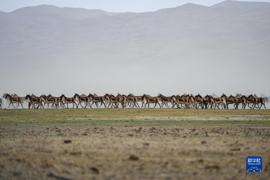 一群藏野驢在阿爾金山國家級自然保護區奔跑(5月23日攝)。