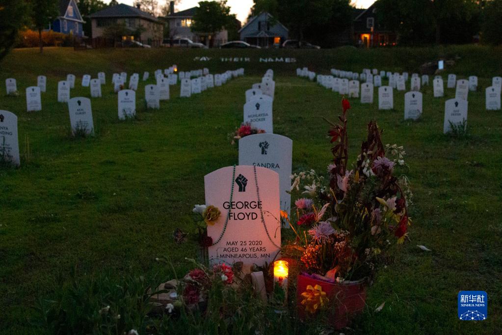 這是5月25日在美國明尼蘇達州明尼阿波利斯市拍攝的弗洛伊德墓碑前擺放的鮮花。