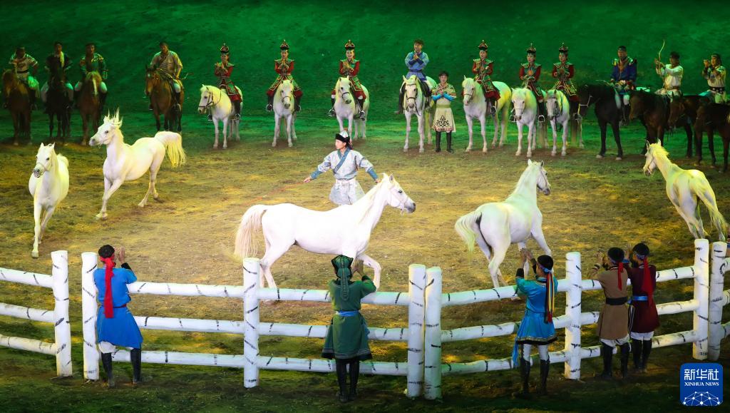 當日,由內蒙古民族藝術(shù)劇院出品的2023年大型馬舞劇《千古馬頌》在呼和浩特上演。該劇以馬術(shù)表演為主,綜合運用了舞蹈、器樂(lè )、雜技等藝術(shù)元素,融合了現代高科技舞臺技術(shù),以全新藝術(shù)形式生動(dòng)演繹了人與馬相遇、相識、相伴、不離不棄、生死與共的情感歷程,體現了人、馬與自然和諧共存的精神。