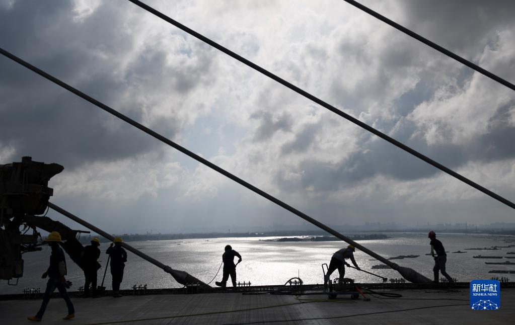 5月25日,建筑工人在鷺洲大橋修筑橋面。