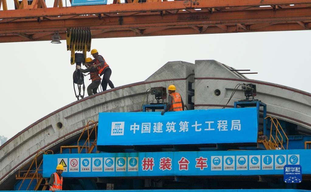 5月26日,工人在新森大道隧道工程的裝配式拱形隧道施工現場(chǎng)拼裝作業(yè)段上工作。