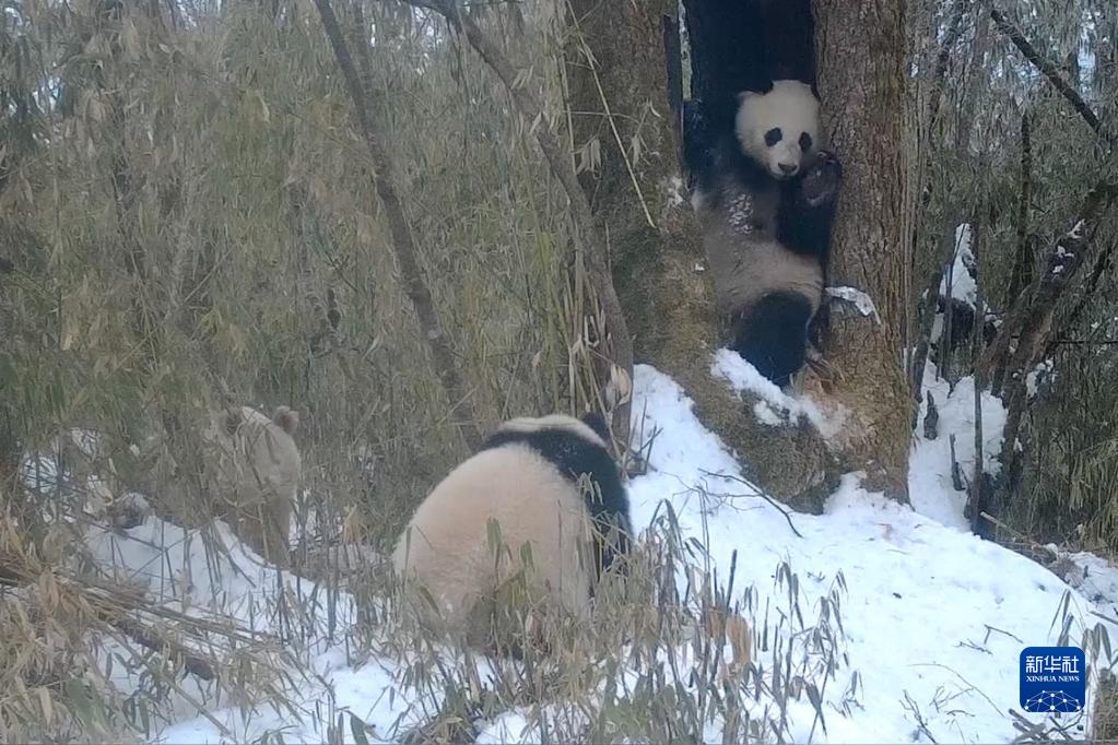 這是2月份,紅外相機拍攝到的白色大熊貓(左一)與一對大熊貓母子同框的畫(huà)面。