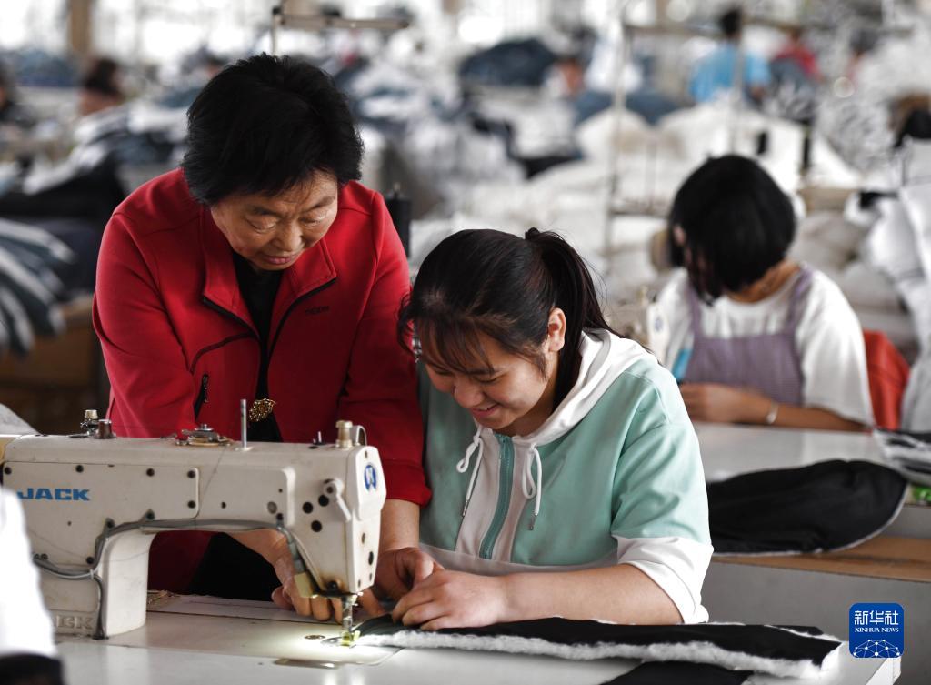 5月25日,山東省日照市莒縣福利服裝廠(chǎng)廠(chǎng)長(cháng)辛興芬(左一)指導工人加工服裝。