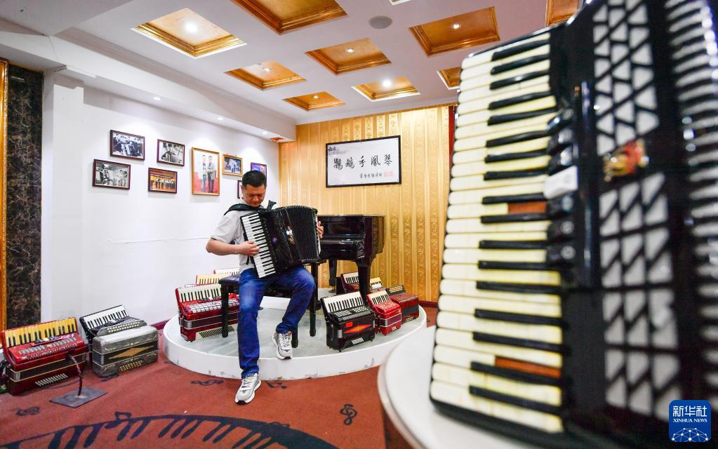 5月25日,在天津鸚鵡樂(lè )器有限公司,工作人員用“羅尼”牌手風(fēng)琴演奏樂(lè )曲。