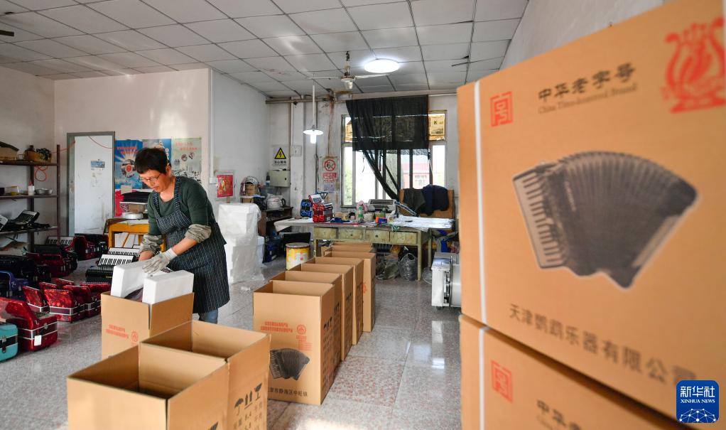 5月25日,在天津鸚鵡樂(lè )器有限公司,工作人員在包裝成品手風(fēng)琴。