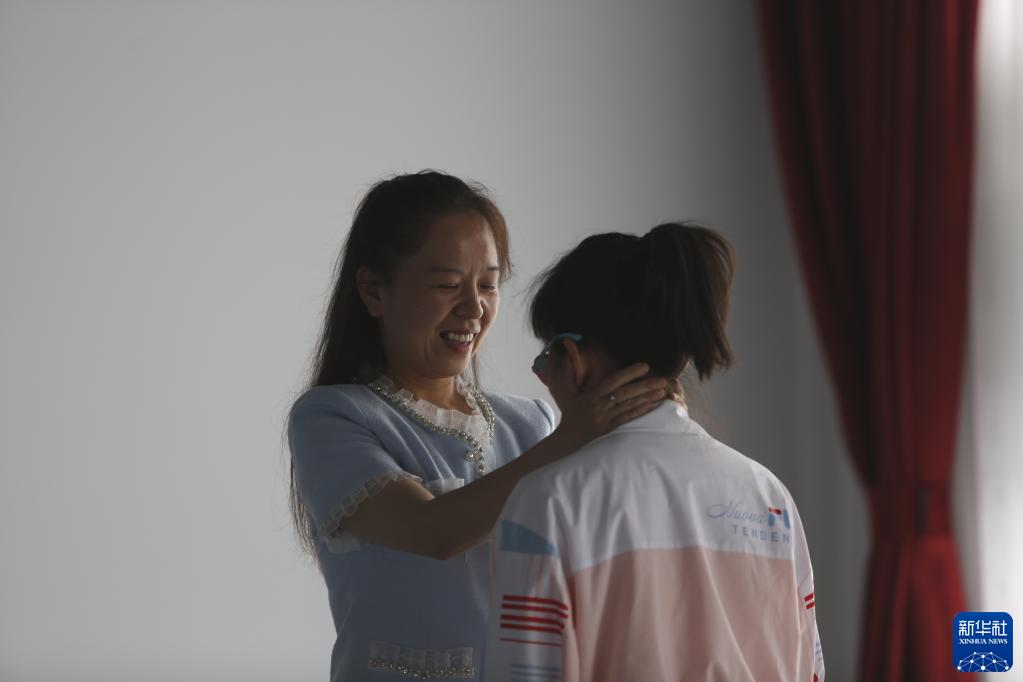 5月24日,在許昌市群眾藝術(shù)館,忽曉(左)與盲童合唱團的團員在練習鋼琴間隙交流。