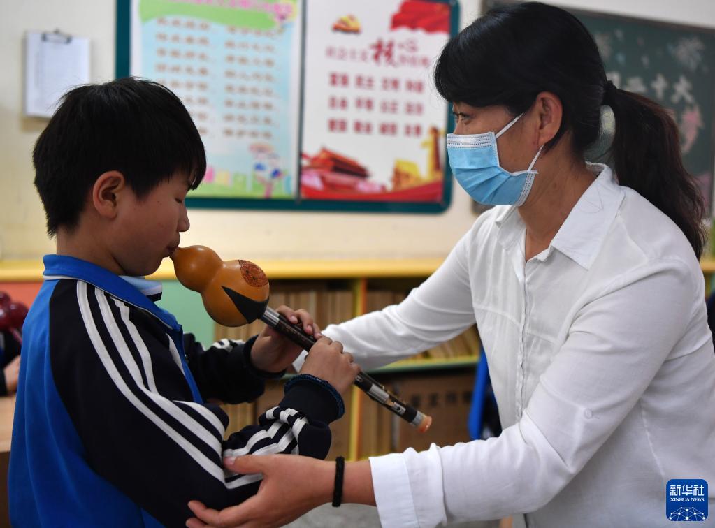 5月23日,許昌市特殊教育學(xué)校的盲童在教室內學(xué)習吹奏葫蘆絲。