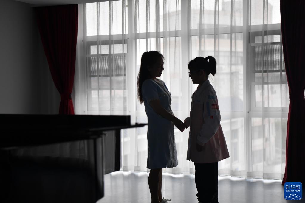 5月24日,在許昌市群眾藝術(shù)館,忽曉(左)與盲童合唱團的團員在練習鋼琴間隙交流。
