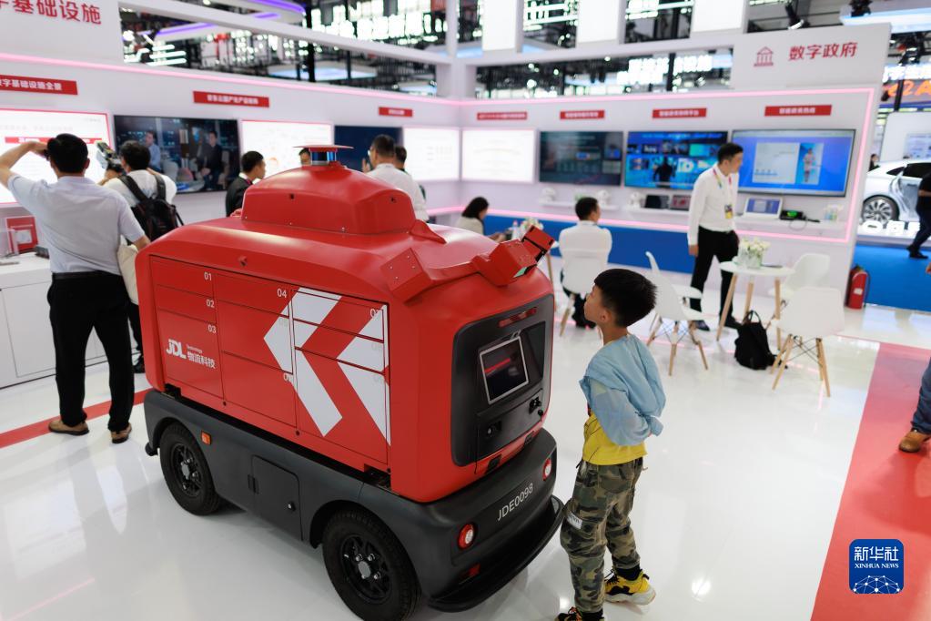 5月26日,一名小朋友在“數博會(huì )”上參觀(guān)物流智能快遞車(chē)。