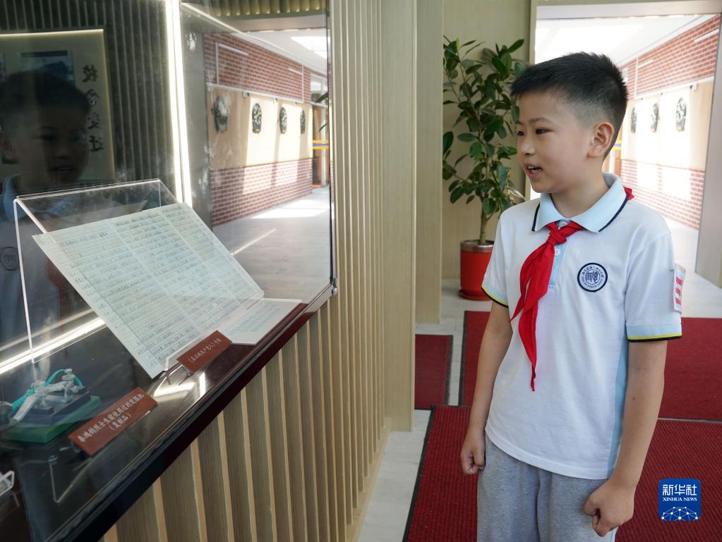5月25日,徐匯區第一中心小學(xué)的學(xué)生、秦鴻鈞烈士的重孫秦翊凱在介紹校史陳列廳展示的太爺爺、太奶奶的手稿和遺物。