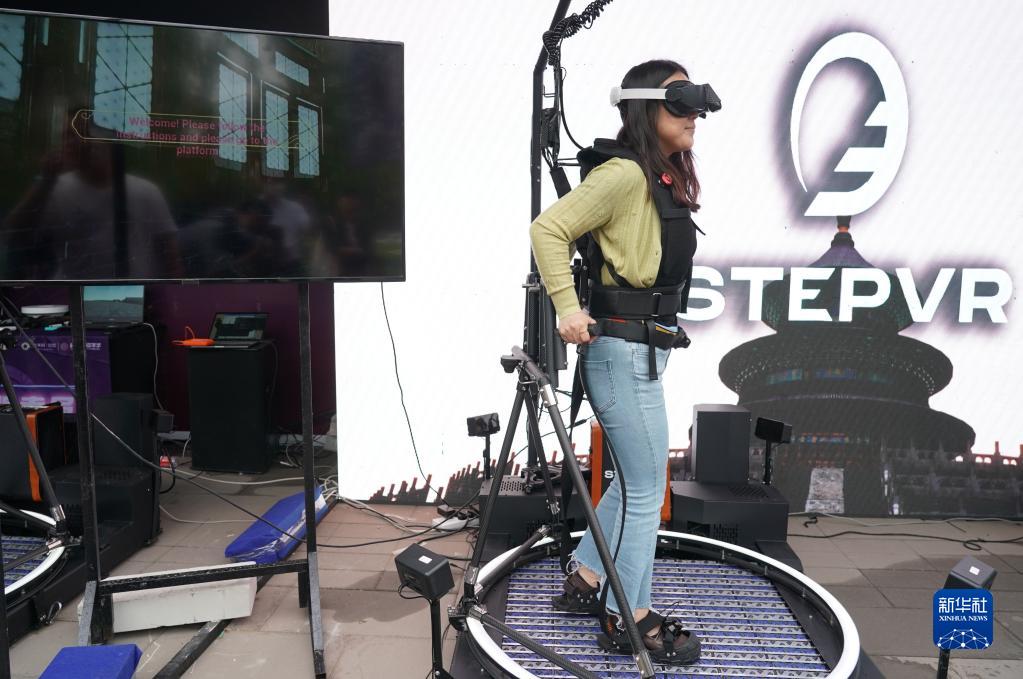 5月27日,觀(guān)眾在硬科技嘉年華上體驗VR萬(wàn)向跑步機。