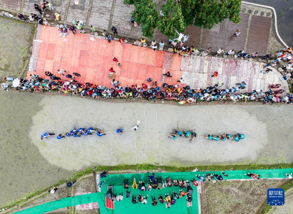5月27日,秭歸縣九畹溪鎮農民在水田里參加拔河比賽(無(wú)人機照片)。