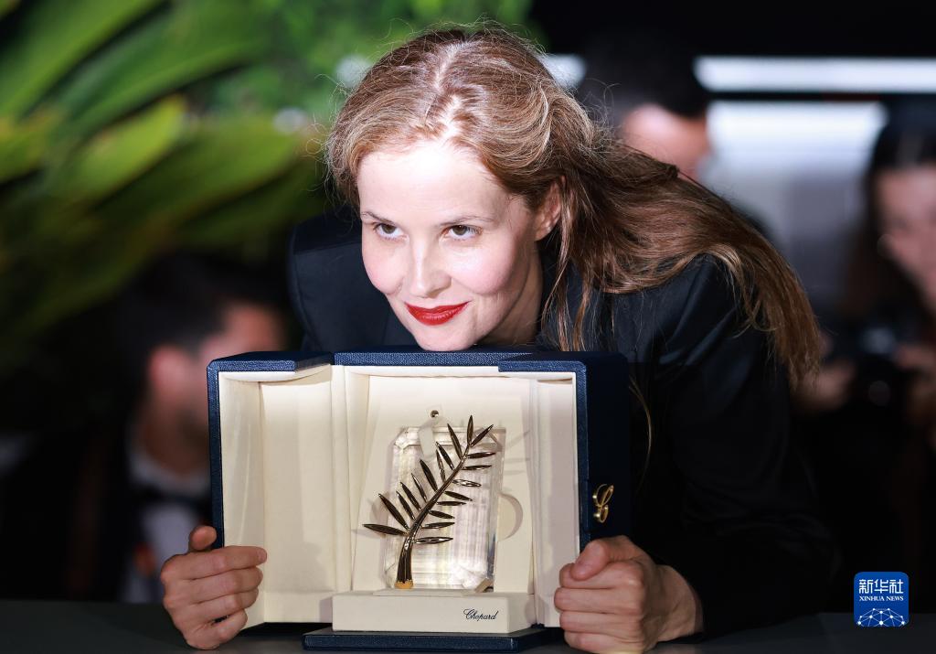 5月27日,在法國戛納,法國導演朱斯蒂娜·特里耶展示“金棕櫚獎”獎杯。
