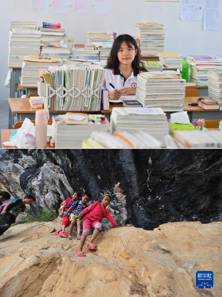 拼版照片:上圖為2023年5月20日,蒙俐谷在大化瑤族自治縣第二中學(xué)高二年級教室里學(xué)習(新華社記者胡星宇攝);下圖為2012年9月3日,在大化瑤族自治縣板升鄉弄雷村,7歲的蒙俐谷(右一)爬懸崖去學(xué)校讀書(shū)(新華社記者黃孝邦攝)。一年后將參加高考的蒙俐谷,希望能考上理想的大學(xué)。