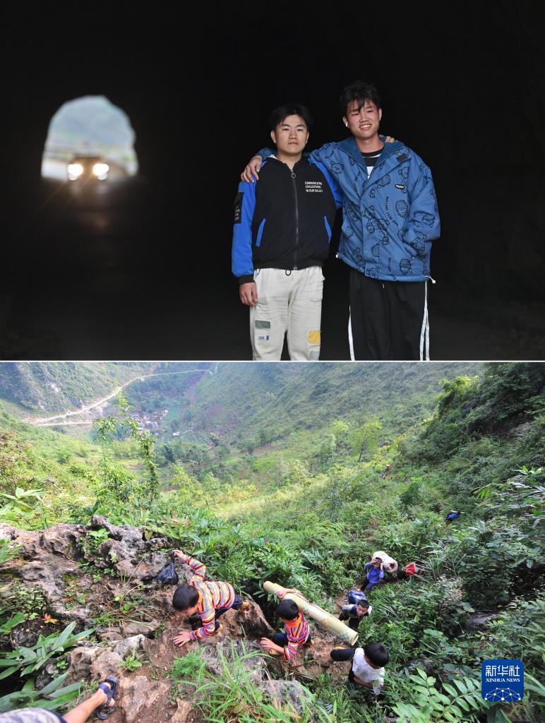 拼版照片:上圖為2023年1月20日,在大化瑤族自治縣板升鄉弄勇村,22歲的蒙宣任(左)和弟弟蒙宣汰站在通往弄勇小學(xué)的隧道旁合影,隧道上方是他們兒時(shí)上學(xué)需要攀爬的“天梯”;下圖為2012年9月3日,在大化瑤族自治縣板升鄉弄勇村,蒙宣汰(左一)、蒙宣任(左二)爬山路去學(xué)校。蒙宣任目前在遼寧省交通高等專(zhuān)科學(xué)校讀書(shū),弟弟蒙宣汰從技校畢業(yè)后在廣東一家汽修廠(chǎng)上班。