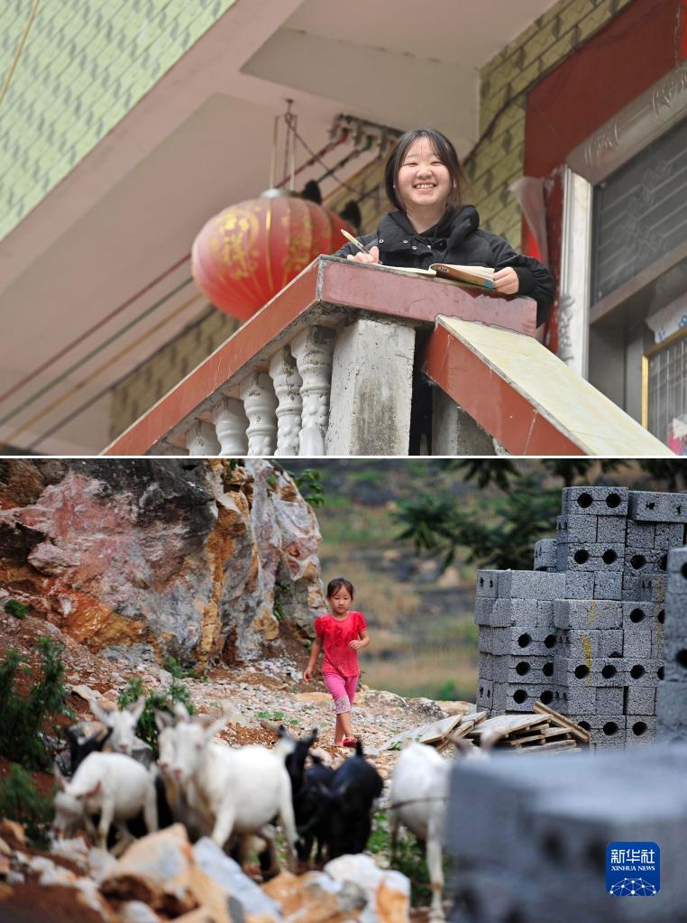 拼版照片:上圖為2023年1月16日,在大化瑤族自治縣板升鄉弄勇村,正在讀初中的藍秀雪在家門(mén)口學(xué)習;下圖為2013年7月14日,5歲的藍秀雪在放羊。16歲的藍秀雪即將參加中考,希望能考上一所好高中。