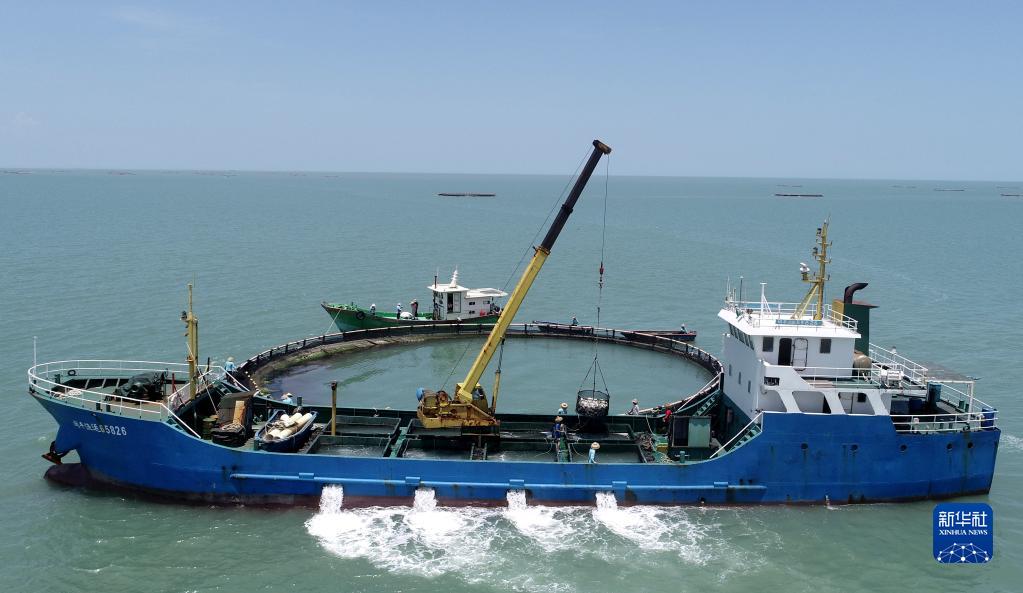 5月27日,在湛江市徐聞縣西連鎮,漁業(yè)工人從徐聞國橋深海養殖有限公司的金鯧魚(yú)深海網(wǎng)箱捕魚(yú)(無(wú)人機照片)。