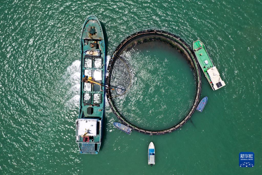 5月27日,在湛江市徐聞縣西連鎮,剛剛收獲的金鯧魚(yú)被裝上運輸船,隨后將運往香港(無(wú)人機照片)。