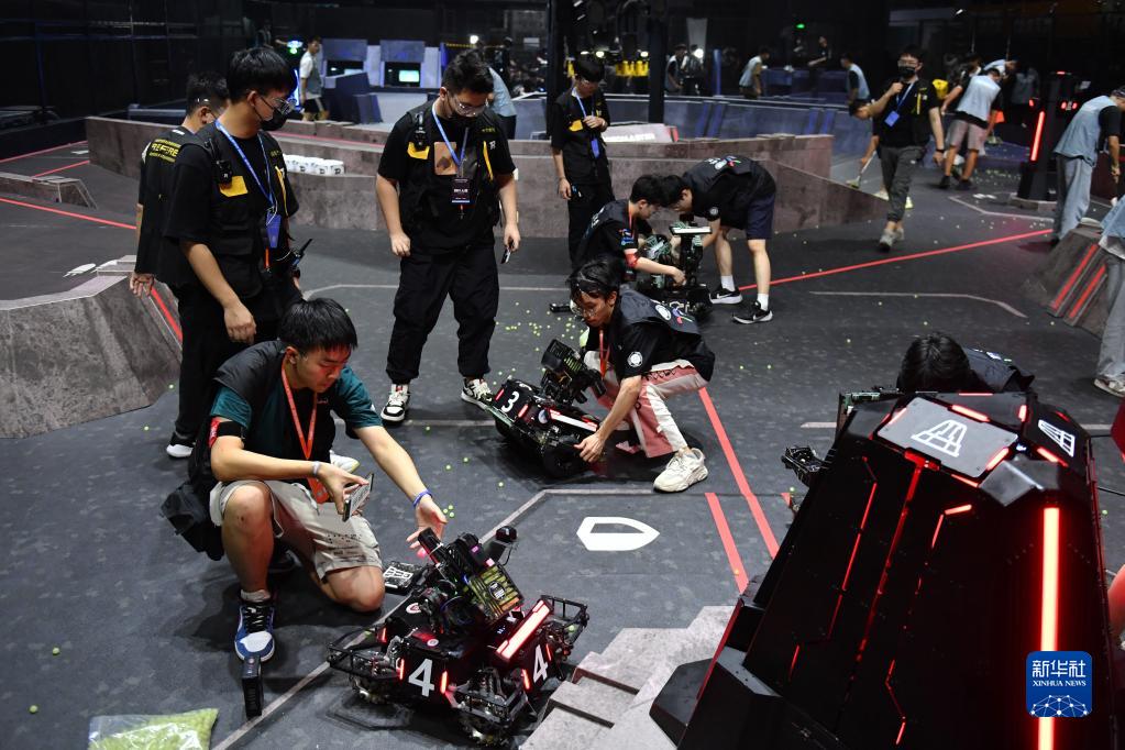 5月28日,深圳大學(xué)RobotPilots戰隊隊員在比賽間隙調整機器人。