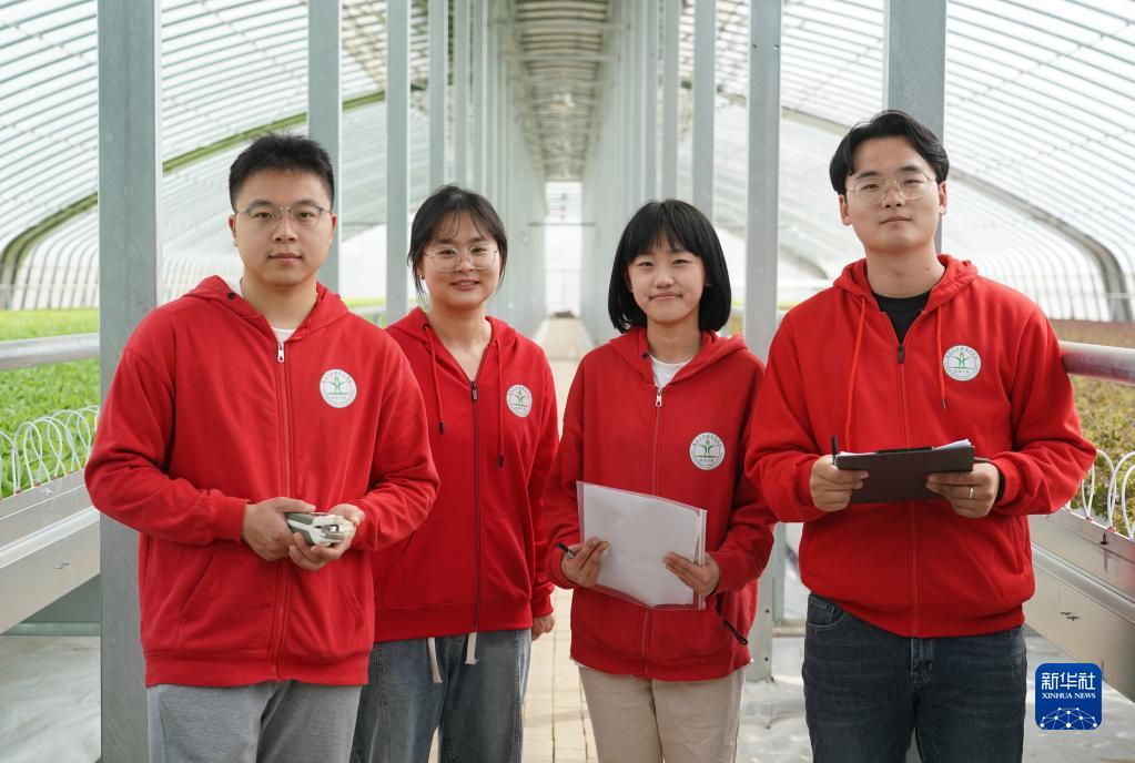 在位于平谷區峪口鎮的京瓦溫室園藝示范園葉菜無(wú)土栽培溫室拍攝的西樊各莊科技小院的大學(xué)生(5月9日攝)。