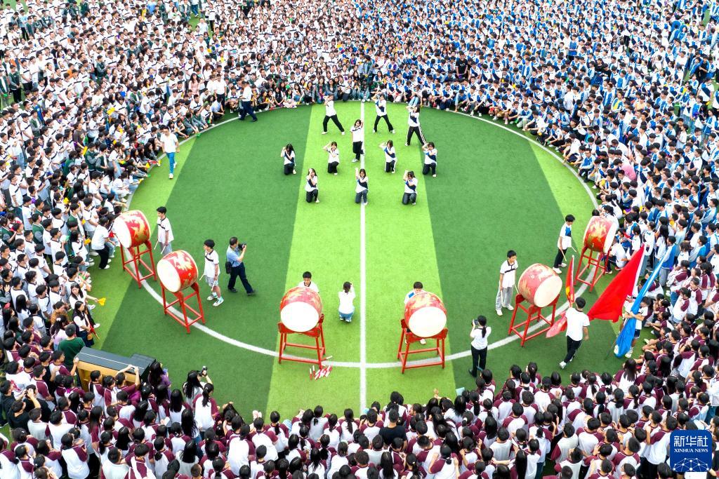 5月29日,湖北省宣恩縣第一高級中學(xué)學(xué)生在快閃活動(dòng)中表演鼓舞(無(wú)人機照片)。
