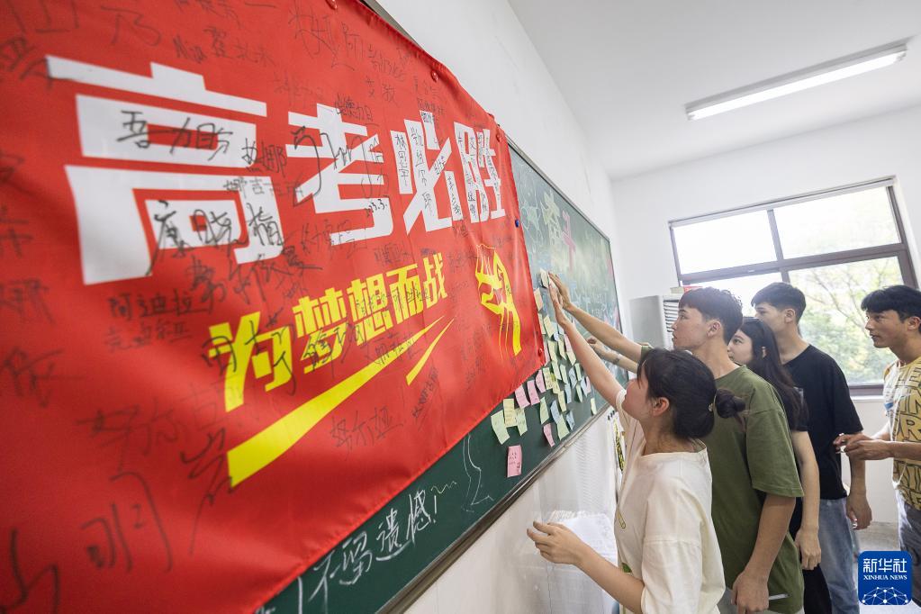 5月28日,在浙江省湖州市長(cháng)興縣職業(yè)技術(shù)教育中心學(xué)校,高三學(xué)生在黑板上粘貼高考寄語(yǔ)。